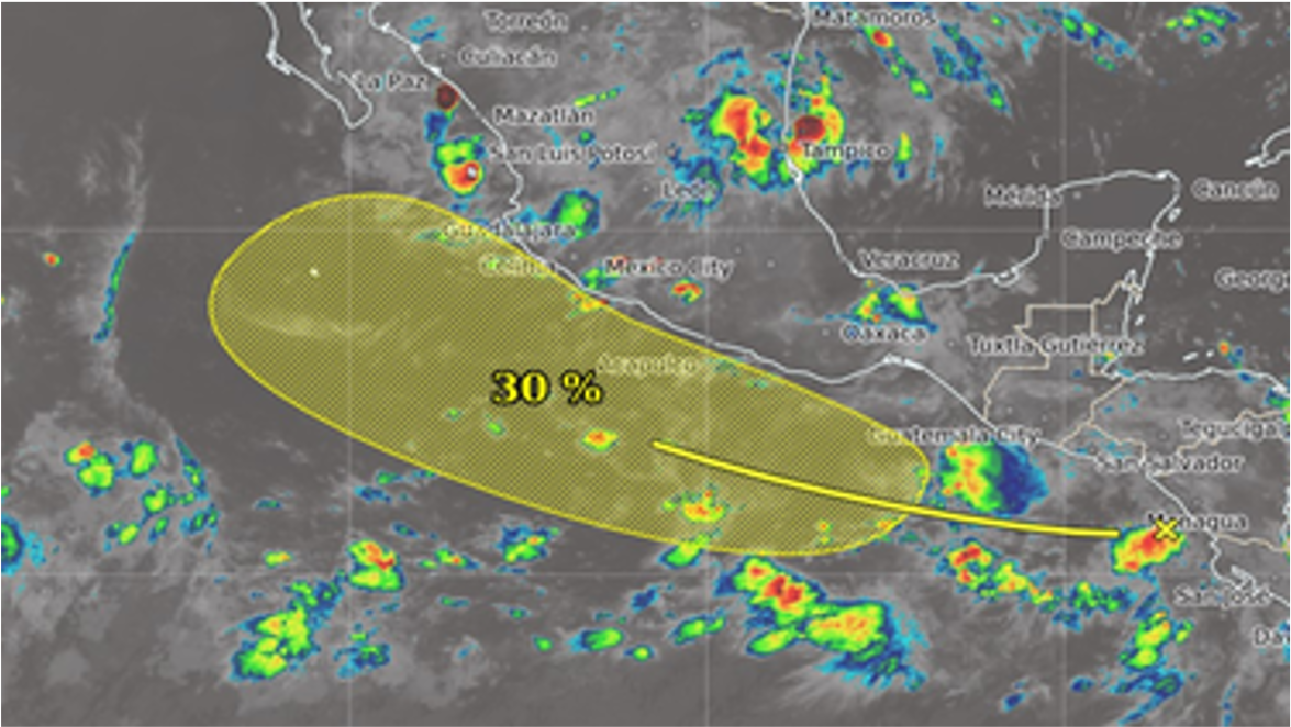 La Comisión Nacional del Agua (Conagua) y el Servicio Meteorológico Nacional (SMN) mantienen el radar encendido en una zona de baja presión al sur del río Suchiate, en la frontera con Guatemala, con 30 % de probabilidad de evolucionar a ciclón tropical en las siguientes 48 horas y hasta 80 % en siete días. Si se confirma, llevará el nombre de «Mario» y se convertiría en el decimotercero fenómeno de la temporada en el Pacífico.