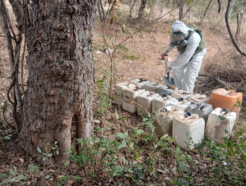 Uno de los puntos centrales de la jornada fue el combate a la producción de drogas sintéticas. En zonas rurales de Culiacán, el Ejército Mexicano desmanteló siete laboratorios clandestinos para la elaboración de metanfetamina y aseguró más de tres mil litros de sustancias químicas utilizadas para la fabricación de estas drogas, lo que representa un golpe directo a la cadena de producción del crimen organizado.